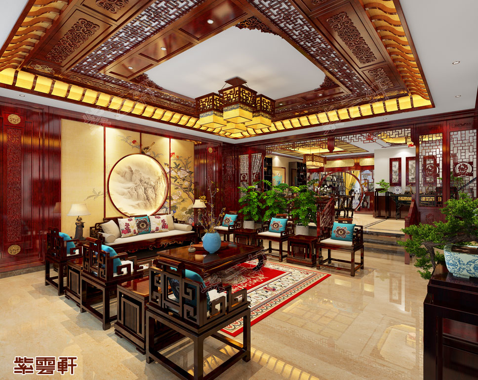 客廳,寬敞大氣的客廳以對稱式的格局營造氣派的空間感。奢華的吊頂設計以大面積的紅木花格為主體,加上周圍一圈溫黃色的環(huán)繞燈帶,傳統(tǒng)中式呈現(xiàn)了富有東方格調(diào)的精致氣質(zhì)。
