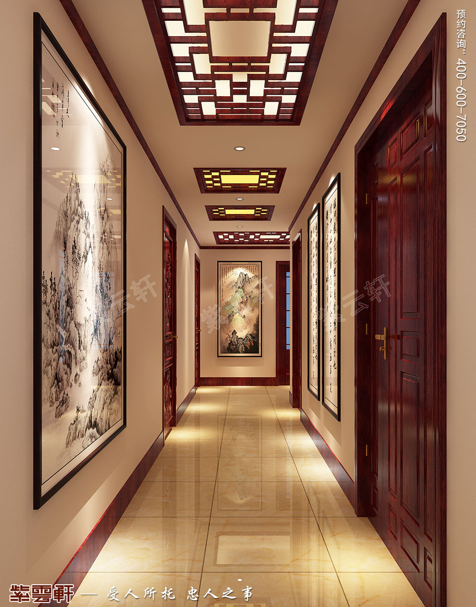 過道現(xiàn)代中式裝修圖,大幅水墨山水國畫氣勢磅礴,與對面字畫共同襯托出過道的大氣安寧,也體現(xiàn)出業(yè)主高雅的生活情操。
